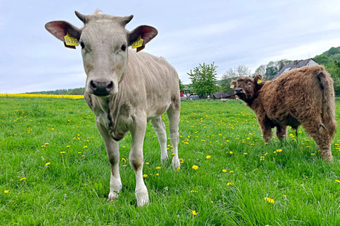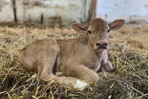 Eddie, geb. am 17.05.2022, ist der Sohn von Eska und der Bruder von Emil. Einem Nachbarlandwirt war sein Deckbulle weggelaufen, der sich auf eine unserer Weiden stellte. Angeblich war nichts passiert, versicherte der Landwirt, aber das stimmte offensichtlich nicht. Eska hat der Charolais-Bulle beglückt, da sie gerade rinderte. Eddie war sehr groß und die Geburt nicht einfach. Auch wenn Eddie nicht geplant war, freuen wir uns doch sehr über den süßen Fratz.