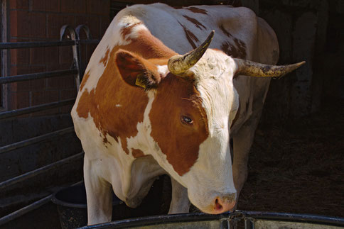 Bastian, geb. am 10.03.2015, stammt aus einer privaten Rettung und lebt in Pension bei uns auf dem Hof. Er war schon in einer Mastanlage und sollte sterben, um als Braten zu enden. Eine liebe Tierschützerin konnte das glücklicherweise verhindern und bat uns um einen Platz auf unserem Hof. Bastian ist zu einem prachtvollen großen Ochsen heran gewachsen, der sehr lieb ist und gern mit seinen Menschen kuschelt. Er versteht sich mit allen Rindern sehr gut und ist wunderschön.