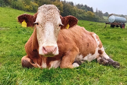 Erika, geb. am 03.03.2018, stammt von einem Landwirt, der sie als letzte Kuh behalten hat, weil sie tragend war. Alle anderen Tiere hatte er schon abgegeben, da er aus der Nutzung ausstieg. Er ist jetzt einer unserer Pensionslandwirte und versorgt einige unserer Rinder liebevoll. Erika hat in Ruhe auf der Weide ihren Sohn Erwin zur Welt gebracht, um den sie sich rührend kümmert. Erika ist eine ganz liebe Seele.