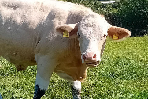Willi, geb. am 12.04.2020, ist unser Überraschungskälbchen. Er ist der Sohn von La Vida und der Bruder von Finola. Seine Mama La Vida war im Jahr 2019 mehrfach von der gesicherten Weide ausgebrochen und unterwegs, um einen Bullen zu treffen. Offensichtlich hat sie sich als reinrassiges Charolais auch einen solchen Bullen ausgesucht. Plötzlich stand sie da mit ihrem Sohn und wir waren ziemlich erstaunt. Willi sieht aus wie seine Mama, die leider über die Regenbogenbrücke gegangen ist. 😥 Er ist zu einem wunderschönen Ochsen herangewachsen.